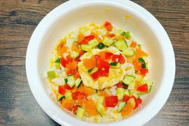 鶏がらスープでキャベツと人参煮た冷凍ストックとご飯とブロッコリーを煮た物です!