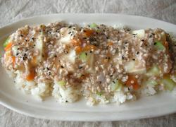 材料:豆腐、鶏ひき肉、ダイコン、ニンジン、小松菜、卵、ご飯、水