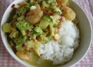 材料:冷凍エビ、干しエビ、かぼちゃ、じゃがいも、オクラ、えのき、きゅうり、ラデッシュ、豆乳、白米